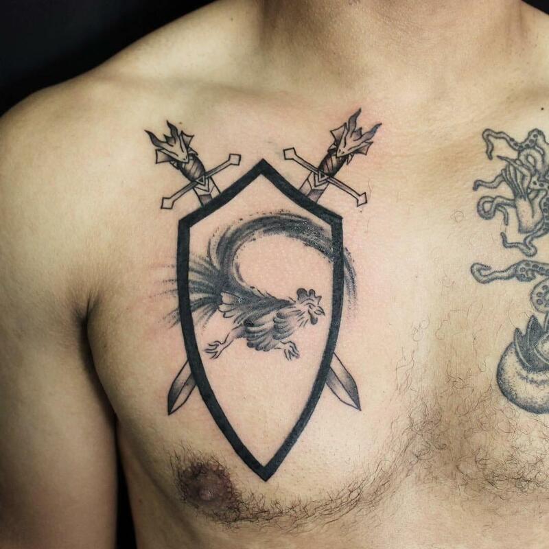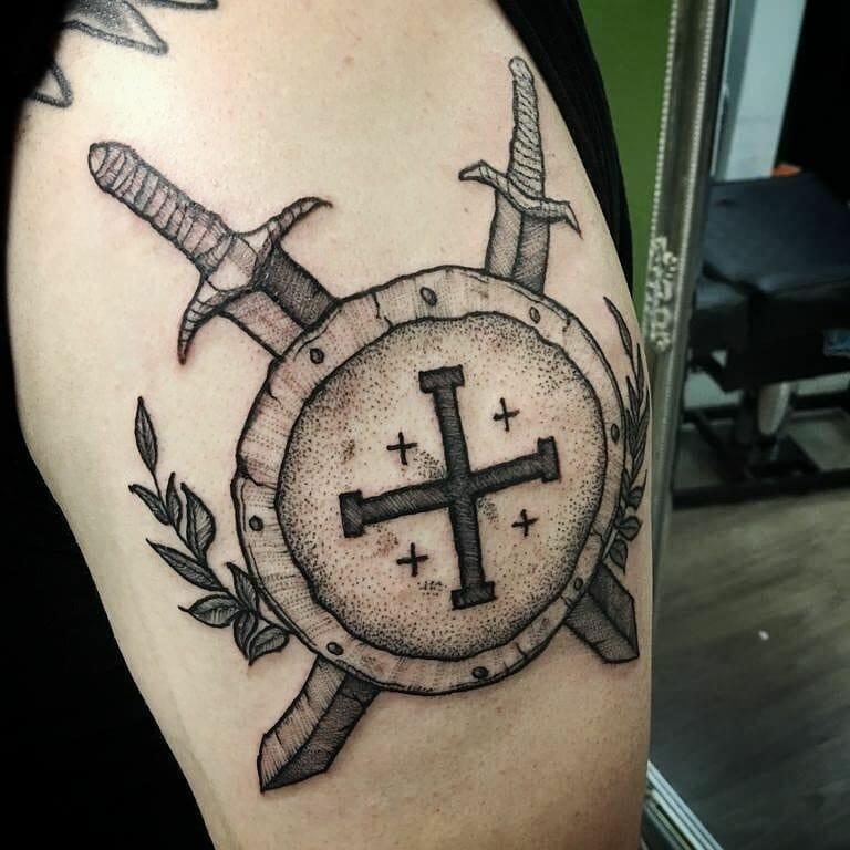 This shield tattoo featuring a Spartan design is ideal for fans of the movie 300! If you’re drawn to knight tattoos and their symbolism, this crest would make a fantastic addition to your chest or shoulder.
