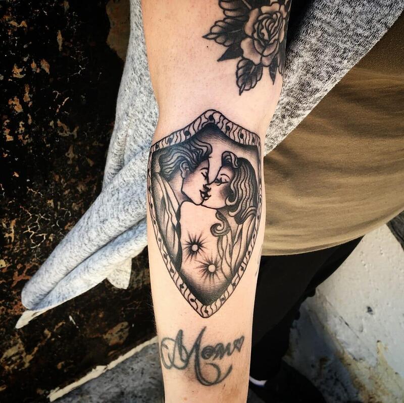 This timeless black and white tattoo will maintain its impact even as it ages. Consider placing it on your arm as a tribute to your parents. Add personal symbols to make this design truly unique and meaningful.
