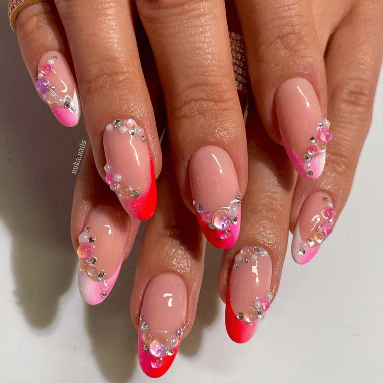 Bedazzled ombre nails combine the allure of gradual color transitions with the dazzling world of crystals. Imagine a soft fade from one color to another, like pink to purple or peach to coral, creating a beautiful depth effect. Then, tiny crystals are strategically placed along the gradient, catching the light and adding an extra touch of glamour. This design is perfect for those who crave a balance between elegance and sparkle, making a statement that’s both sophisticated and eye-catching.