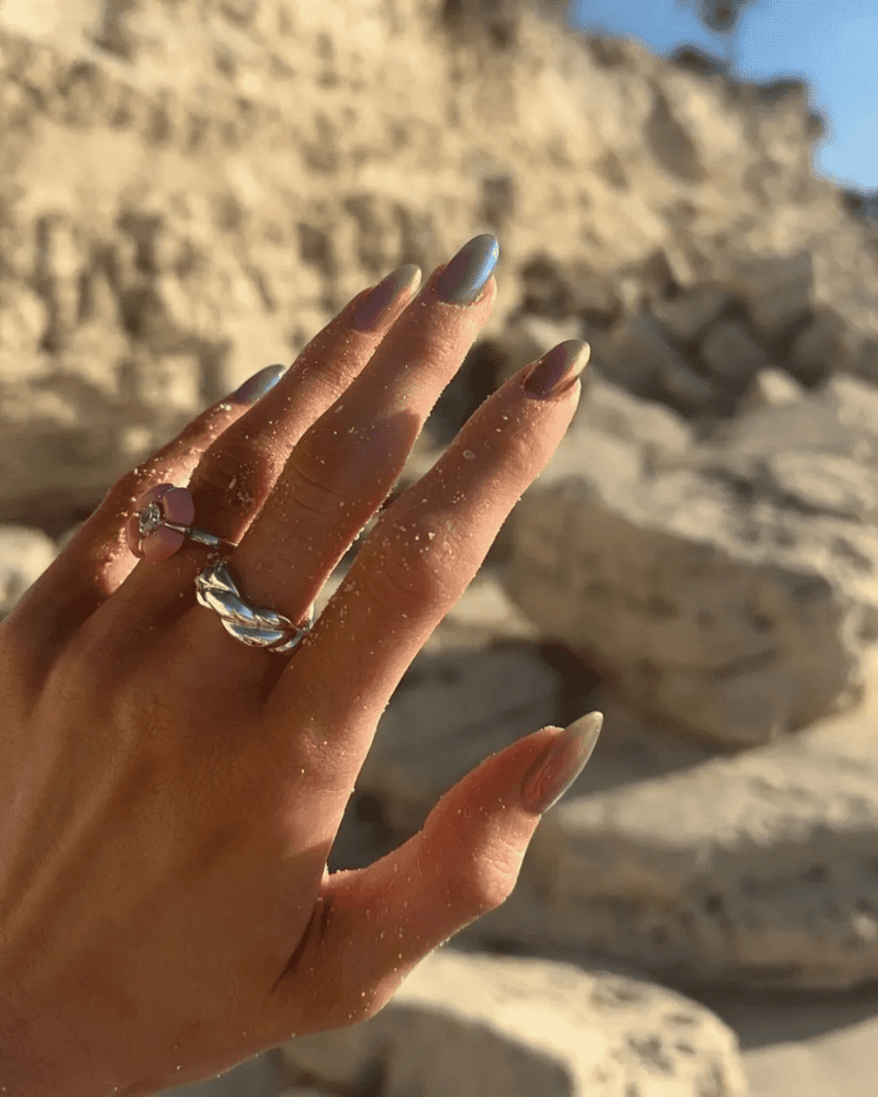 This manicure is painted in a soft seafoam green color, reminiscent of calm ocean waters on a sunny day. Each nail is decorated with subtle shimmer or small sea-inspired accents like seashells or starfish, adding a touch of beachy charm. This calming and fresh palette brings a sense of peace and tranquility to your fingertips, perfect for those who love the beauty of the sea. It’s a sophisticated yet elegant choice that captures the essence of a relaxing day by the sea. If you’re a guest at a beach wedding and unsure of what to paint on your nails, this is the perfect choice. Pair it with a beach wedding guest dress for a complete and stunning look.