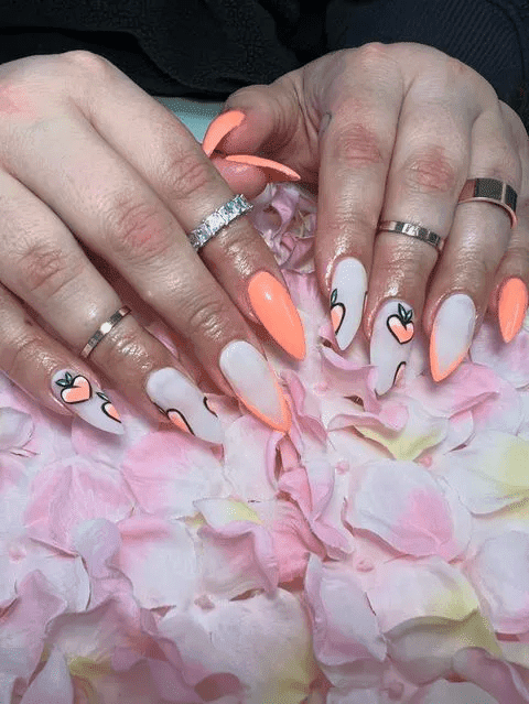 Dewy sunset nails capture the magic of the sky just after the sun goes down. Imagine a blend of soft orange and pink, like the colors you see in the clouds. They might even have a touch of shimmer, like the reflection of the sun. This dreamy look is perfect for summer nights or anyone who loves beautiful sunsets.
