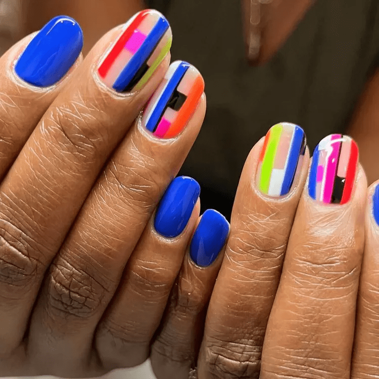 Nostalgic neon nails are all about channeling the vibrant energy of the 80s and 90s. Think Miami Vice pinks, electric yellows, and atomic blues, lighting up your fingertips with a retro flair. Play with bold color blocking, geometric shapes, or even recreate iconic pop art graphics for a truly throwback vibe. These eye-catching nails are perfect for summer nights out, adding a playful nod to the past with a fresh, modern twist.