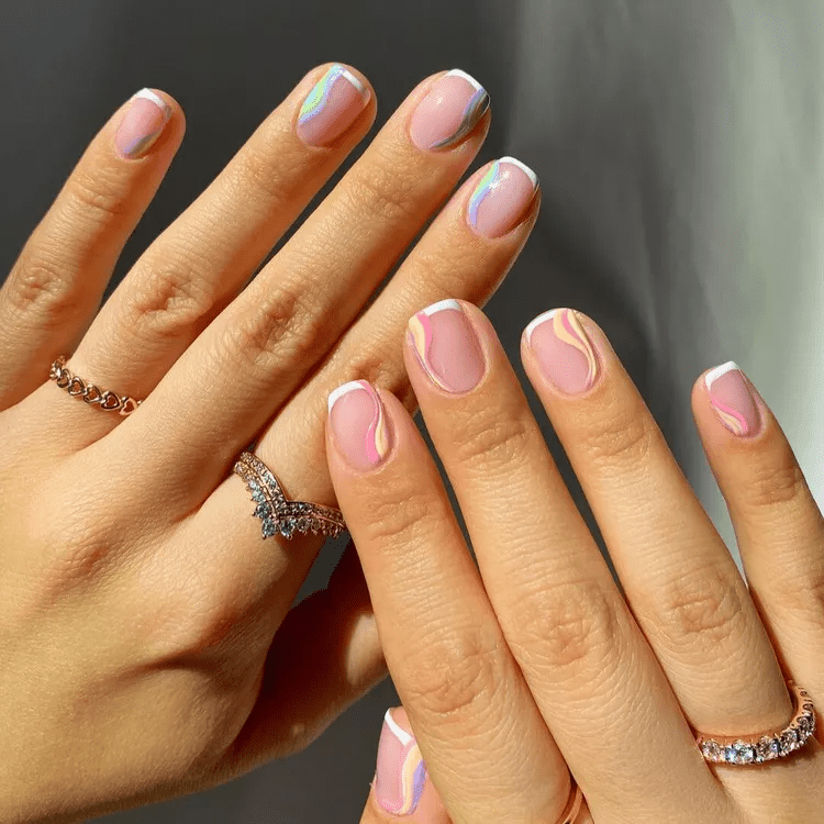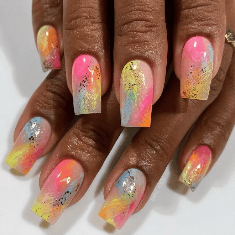 Rainbow abstract nails are a vibrant explosion of color and creativity on your fingertips. Ditch the typical rainbow order and embrace a free-flowing approach. Imagine swirls and splatters of color in every hue of the rainbow, playfully blended and layered across your nails. Metallic accents like silver or gold can add a touch of modern edge, while negative space allows the natural nail to peek through for a more balanced look. Rainbow abstract nails are perfect for those who want a unique and eye-catching statement piece that celebrates the joy and energy of summer.