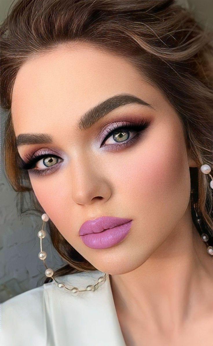 This look features a captivating mix of purple and brown hues, creating a striking contrast that accentuates the verdant allure of green eyes. A delicate sweep of shimmer on the lids catches the light, turning every blink into a mesmerizing spectacle.