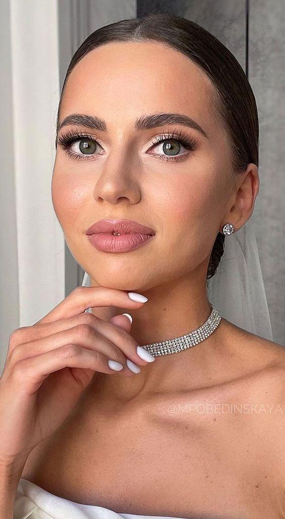 This makeup combines old-world charm with modern elegance, embodying the essence of soft bridal beauty. Featuring simple, subtle shades, it enhances the bride’s natural allure, particularly flattering for those with pale skin and blonde hair.