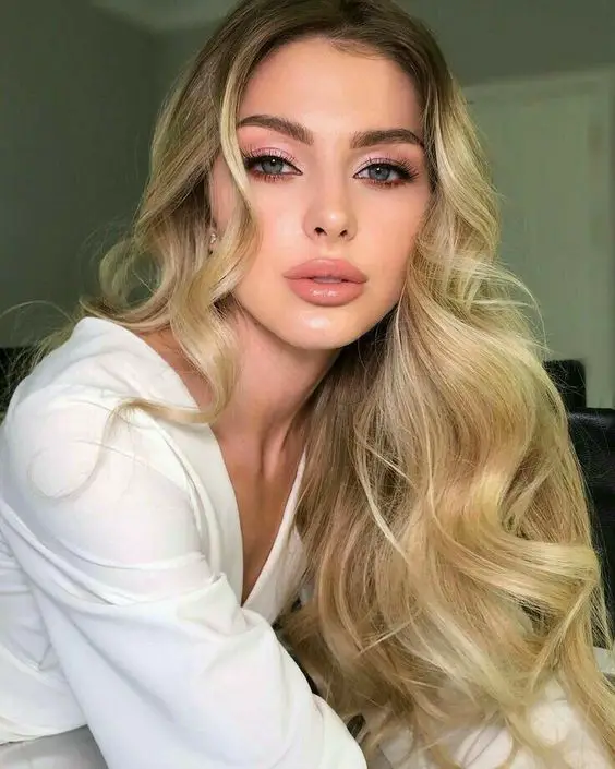 This natural bridal makeup features soft brush strokes that complement pale skin, enhancing the eyes while preserving their natural beauty. It’s a subtle hint of color. This style embraces the effortless charm of brides with blonde hair.