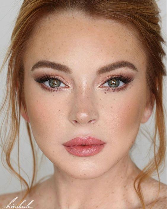 Picture a fall wedding with leaves in vibrant oranges and reds; this makeup echoes that warmth. The soft application, complemented by a hint of red, provides a colorful eye narrative that lets green eyes shine against the backdrop of autumn’s embrace.