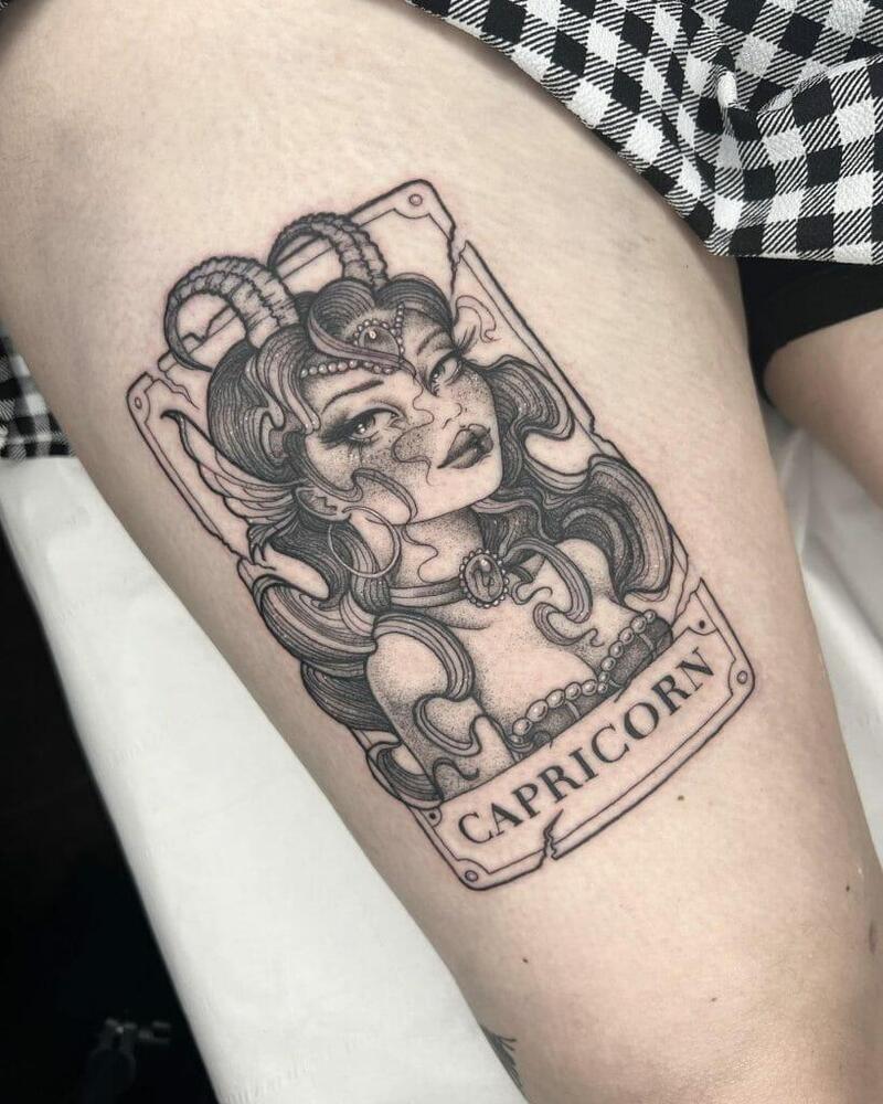 Expressing the core attributes of the Capricorn zodiac sign, this tattoo encapsulates the traits of focused determination and an unwavering gaze. Introducing a touch of mystery and allure, it enriches the portrayal with intricate details.