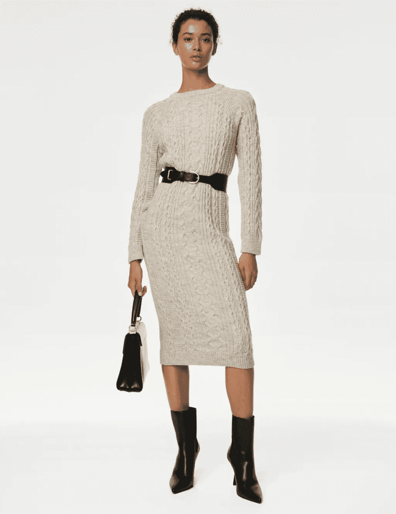 MARKS & SPENCER CABLE KNIT CREW NECK MIDI KNITTED DRESS