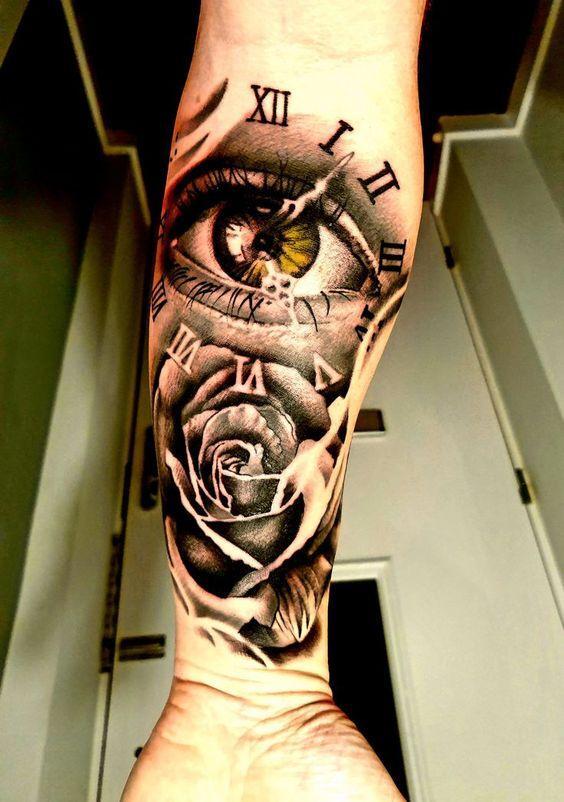 Clock tattoos symbolize time and serve as a reminder to live life to the fullest, acknowledging the limited nature of our time. Often associated with the balance between life and death, these timepieces are frequently used in memorial designs. For those who have lost a loved one, a clock tattoo can be a meaningful tribute, with the hands indicating the time of their passing. Conversely, it can also celebrate joyous occasions like the birth of a child. A half sleeve provides ample space to add personalized details such as roses, skulls, names, and significant dates.