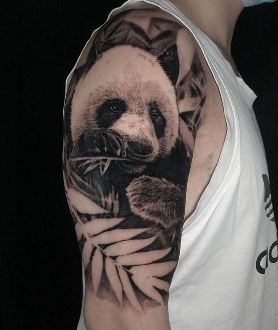 BLACK AND GRAY PANDA HALF SLEEVE TATTOO