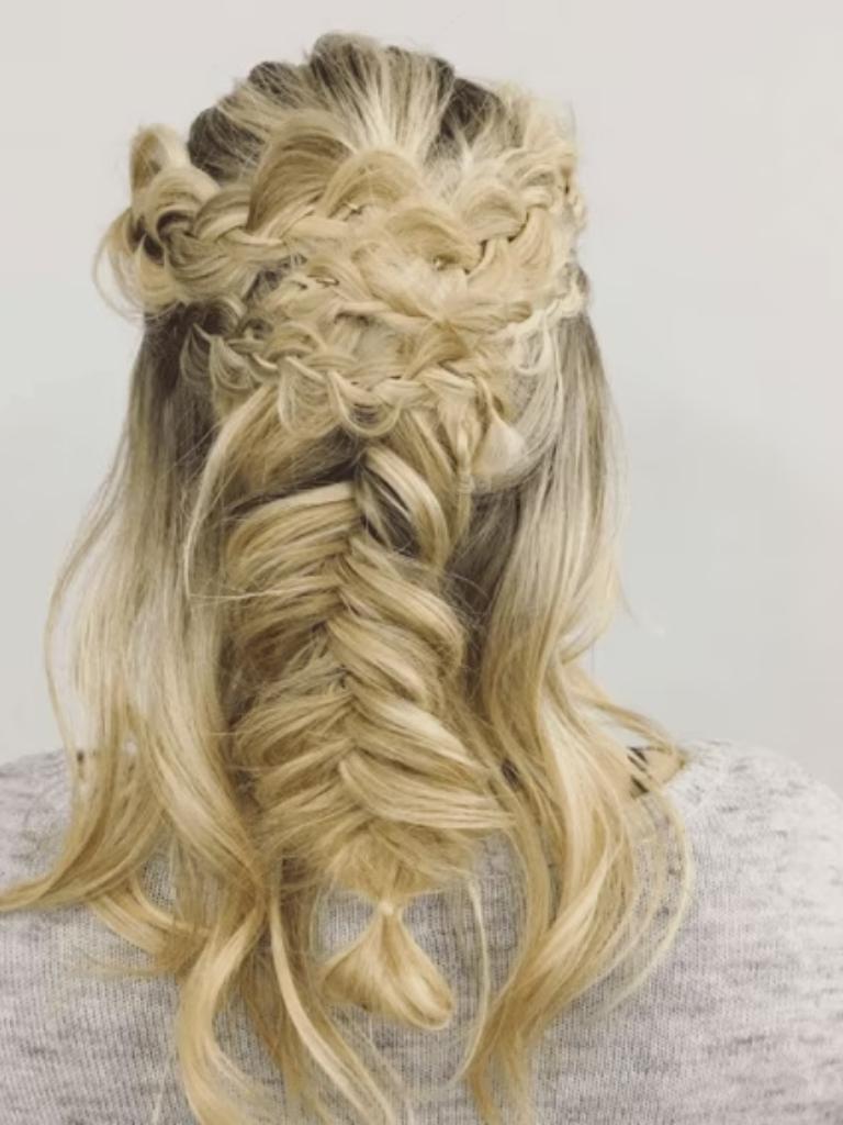This stunning style is just how we imagine fairytale princesses would wear their hair! The varying sizes of fishtail braids wrap beautifully over one another, creating a crown-like effect. Pair it with textured, wavy locks for a romantic twist on the look.