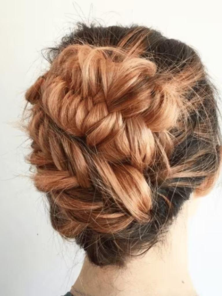 This updo offers a unique twist that will definitely have people wondering if you styled it yourself! Start by putting your hair into a ponytail, braid it into a fishtail plait, and then wrap the braid flat against your head.