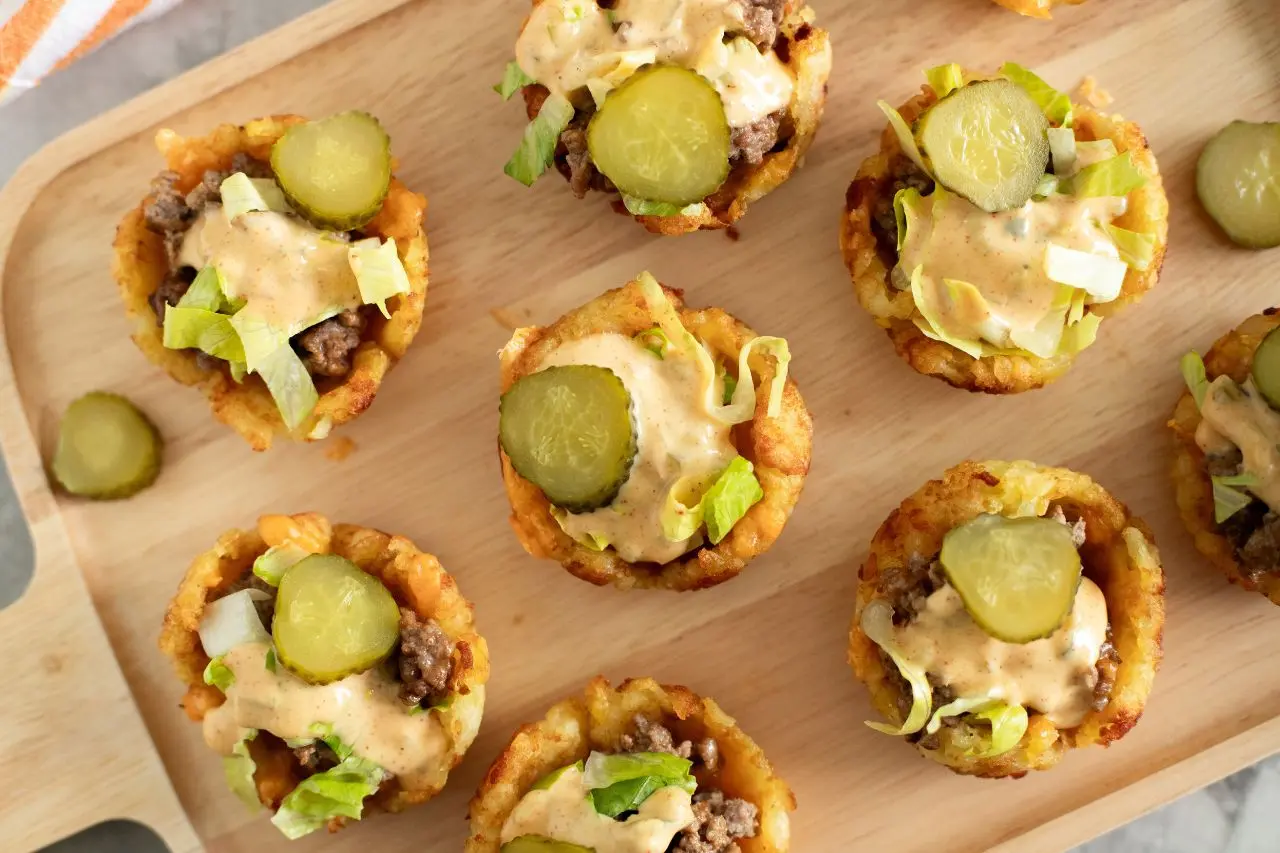Spice up your summer with these irresistible viral burger cups featuring a mouthwatering secret sauce! This mini burger cup recipe combines tater tots and burgers in the most delicious way. Crispy tater tots form a golden, cup-like base, loaded with melty cheese, seasoned ground beef, and a drizzle of the ultimate burger sauce. Top it off with crisp lettuce and tangy pickles for the perfect two-bite treat everyone will crave!