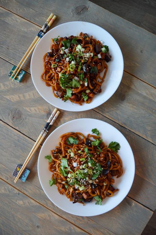 - Turn the heat to medium. Add half of the noodle sauce and stir to coat the noodles. Add the miso tofu or chicken, roasted eggplant, and the remaining sauce. Stir until everything is well combined, about 1–2 more minutes.